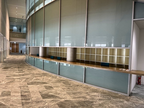 また、ホワイエ部分は天井高14メートルを誇り、開放感あふれる広々とした空間です。このホワイエは、円形部と一体で利用できるだけでなく、会議やセミナーを円形部で行い、ポスター展示や飲食を伴う懇親会をホワイエで分けて利用することも可能です。円形部での会議やセミナーに集中しながら、ホワイエでの展示や交流を行うことができる、非常に柔軟なスペースです。